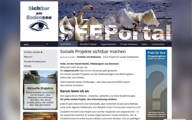 Das SeePortal ist eine Plattform für soziale Projekte, Initiativen und Organisationen aus der Bodenseeregion. Im Mittelpunkt steht Sichtbarkeit durch klare Darstellung, nicht durch Lautstärke.