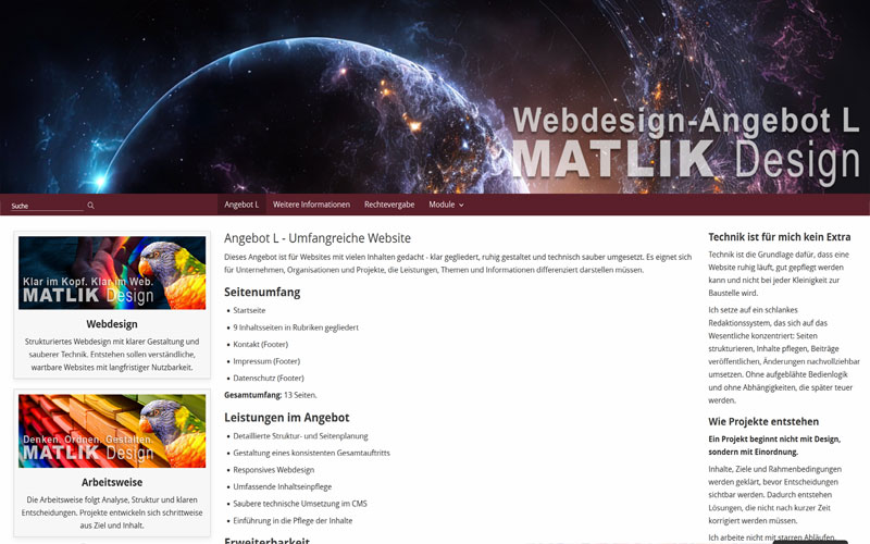 - Ich verwende kein großes Mainstream-System, weil diese Lösungen in kleinen Projekten oft mehr Komplexität erzeugen als Nutzen. Viele Funktionen sind für Standardfälle gebaut, nicht für Klarheit. Mir ist wichtig, dass die Administration ruhig bleibt: Für Redakteure, für Betreiber und für Wartung.